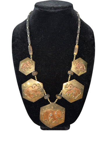 VINTAGE SILVER, BRASS & COPPER ELEPHANT DISK & BEAD CHUNKY STATEMENT NECKLACE