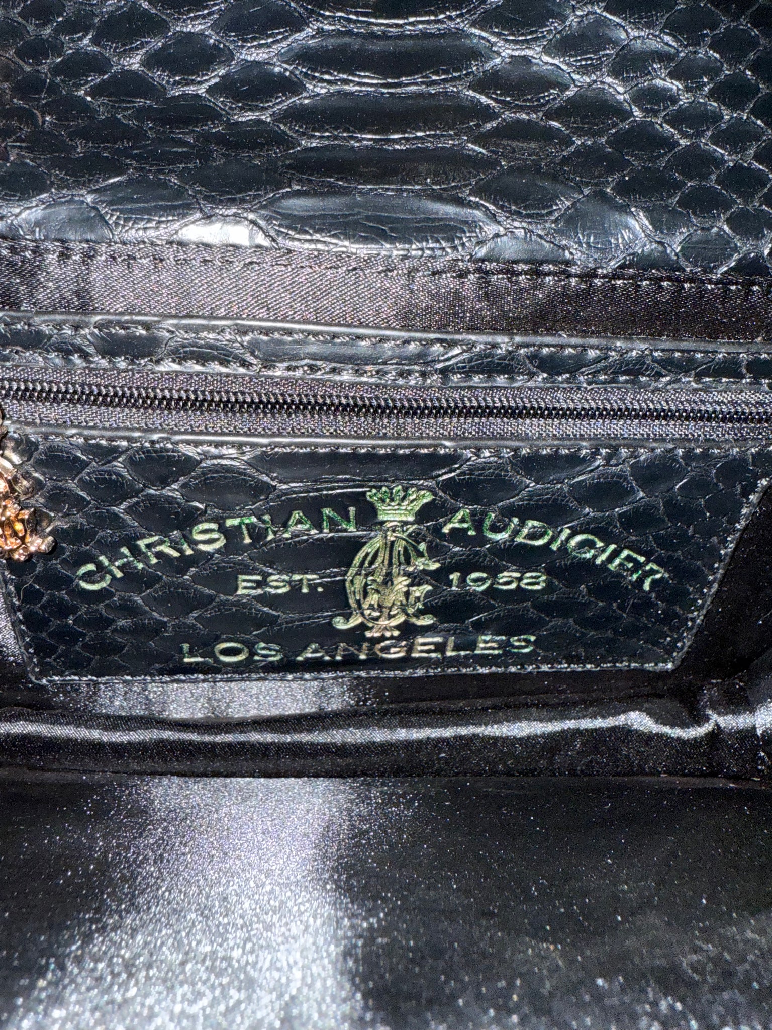 - Material: Faux leather with faux snakeskin trim, satin interior lining