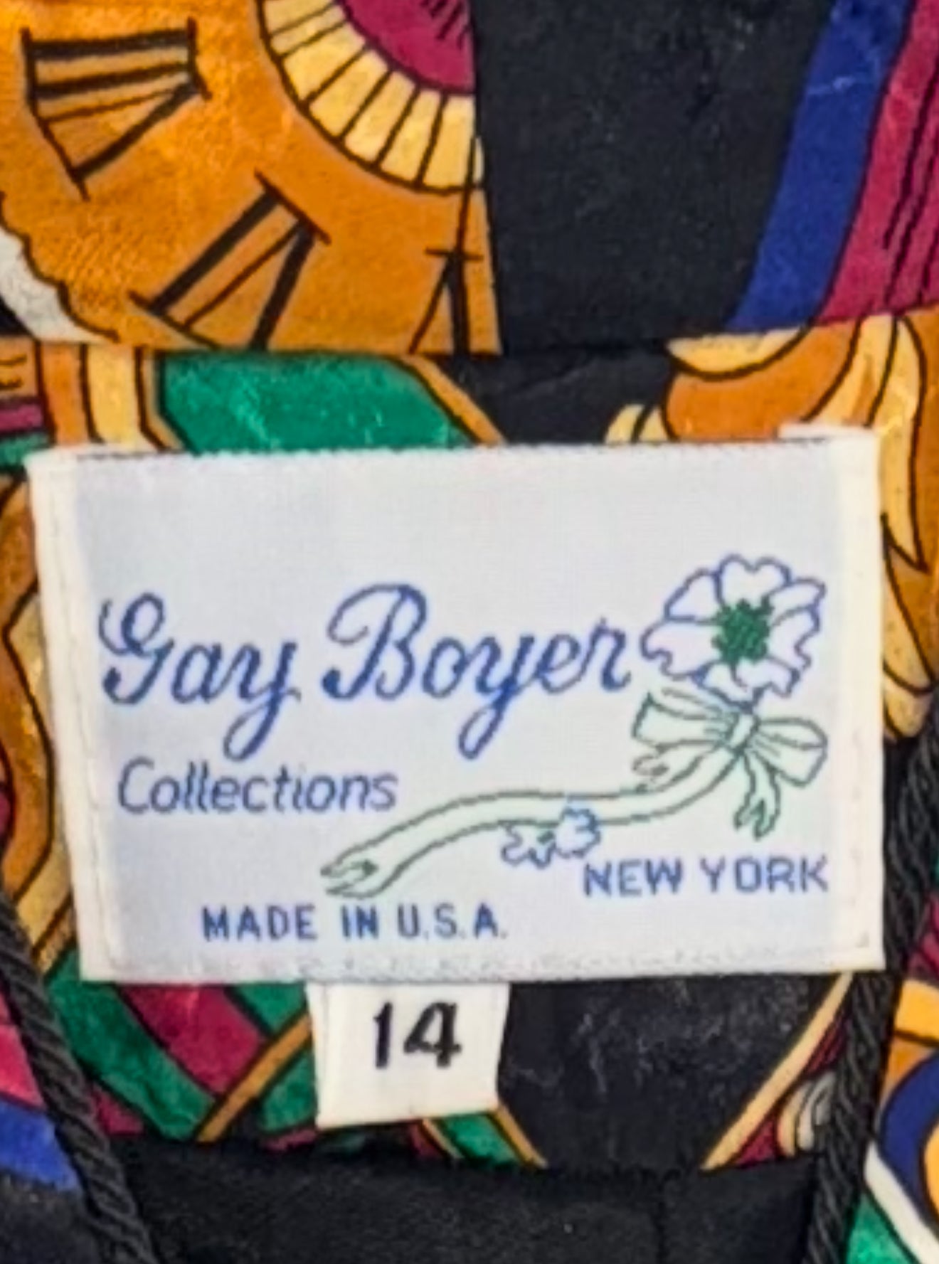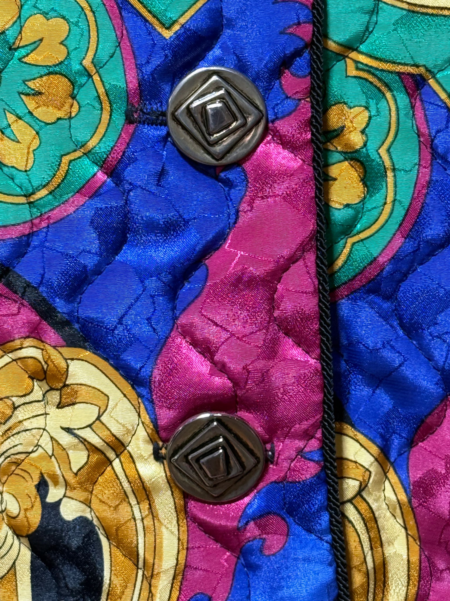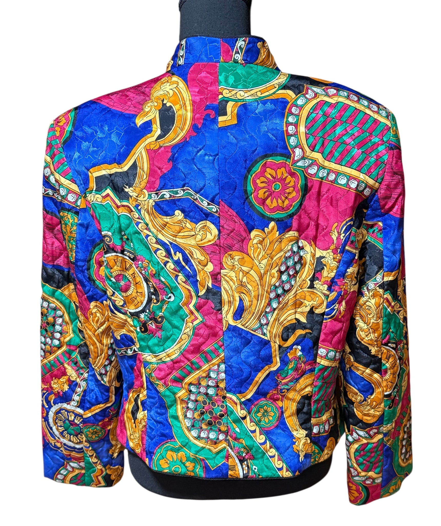 Step into bold, timeless style with this vibrant quilted jacket by Gay Boyer Collections, New York. Featuring an eye-catching baroque-inspired pattern in jewel tones of royal blue, fuchsia, emerald green, and gold, this statement piece is perfect for collectors and lovers of unique vintage fashion.